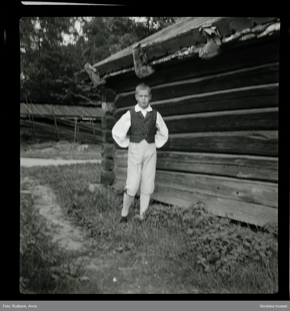 107 Skansen Ringleksbarn. En pojke i folkdräkt, utomhus på Skansen.