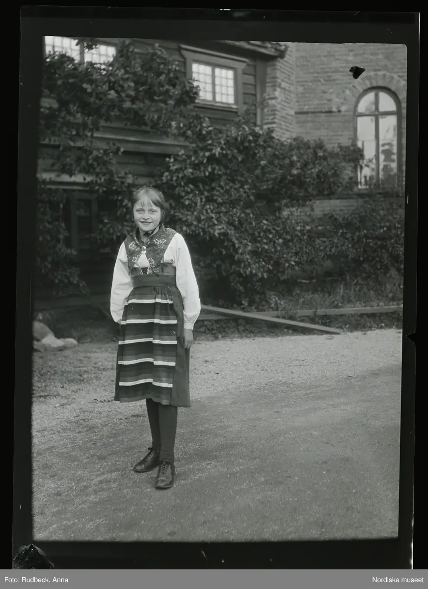 43 Skansen Ringleksbarn. En flicka i folkdräkt, utomhus på Skansen.