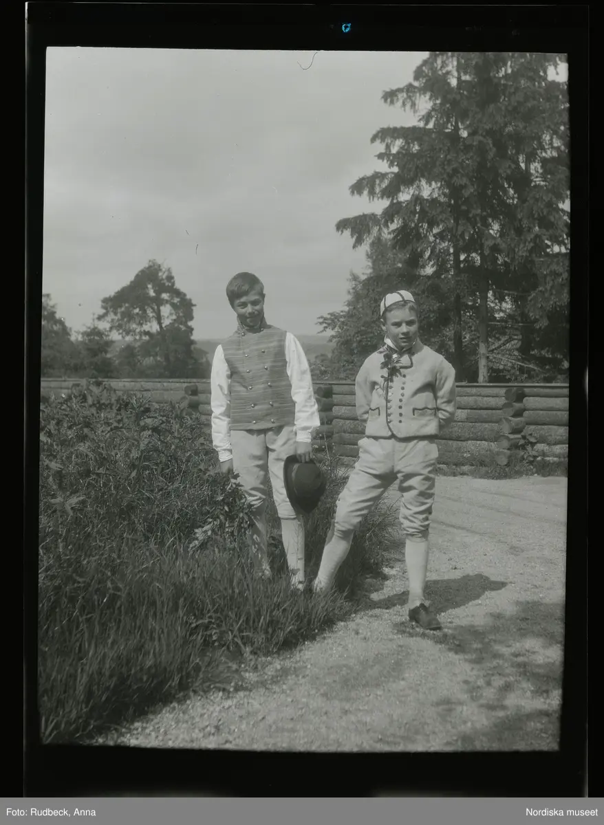 15 Skansen Ringleksbarn. Två pojkar i folkdräkt, utomhus på Skansen.