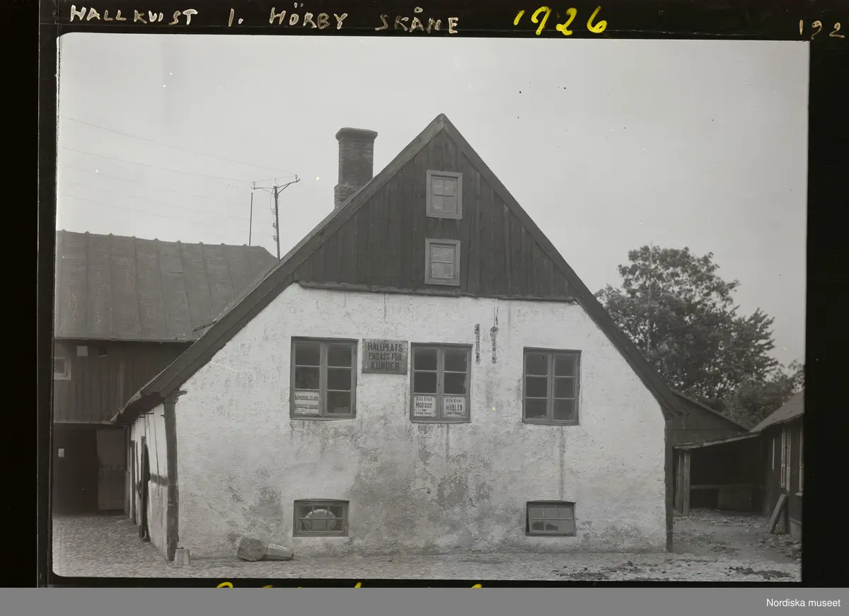 Gaveln av en byggnad med butik, skyltar i fönstren och på fasaden.