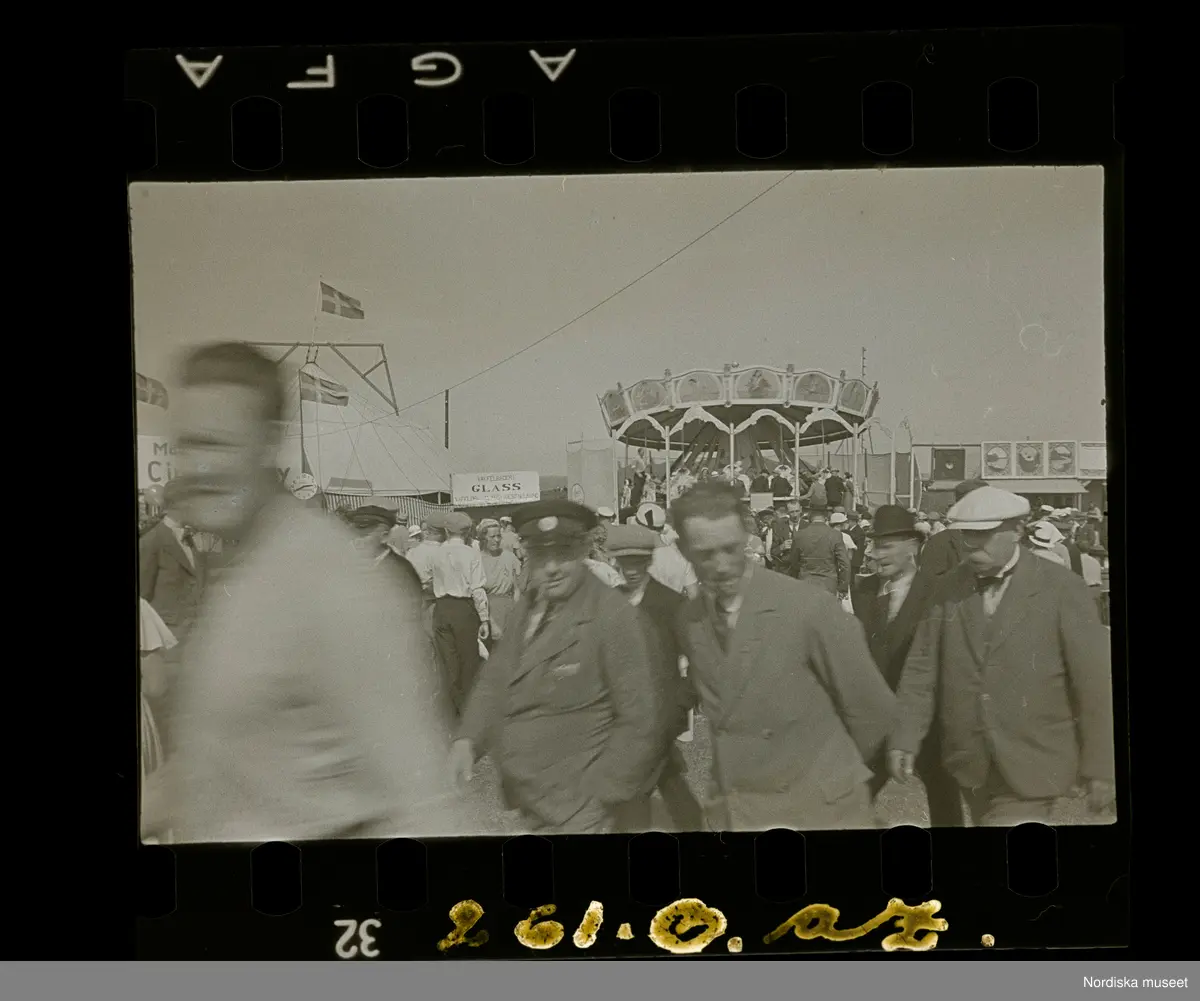 Människor på marknad/ tivoli. Karusell i bakgrunden.