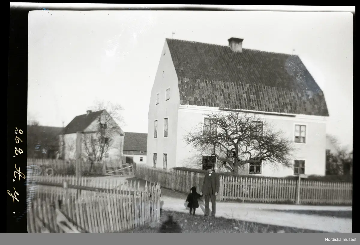 En man håller ett barn i handen, ståendes intill vägen framför ett hus.