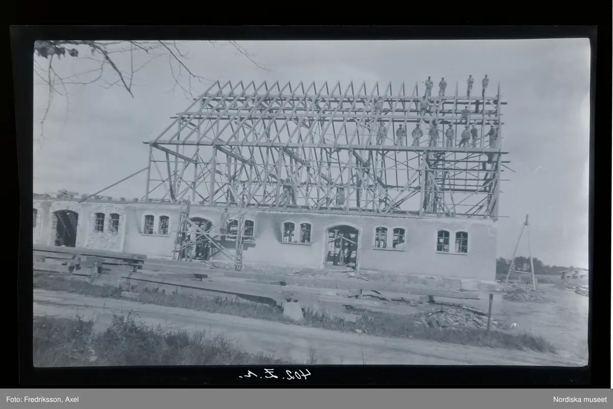 Ladugård under återuppbyggnad efter brand. Ett arbetslag står uppe på bjälklaget.
