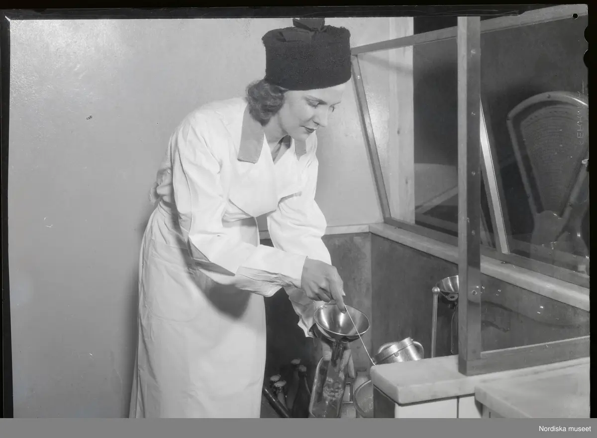 En kvinna arbetar i ett kök med att fylla en tom flaska, med hjälp av en tratt och en slev.