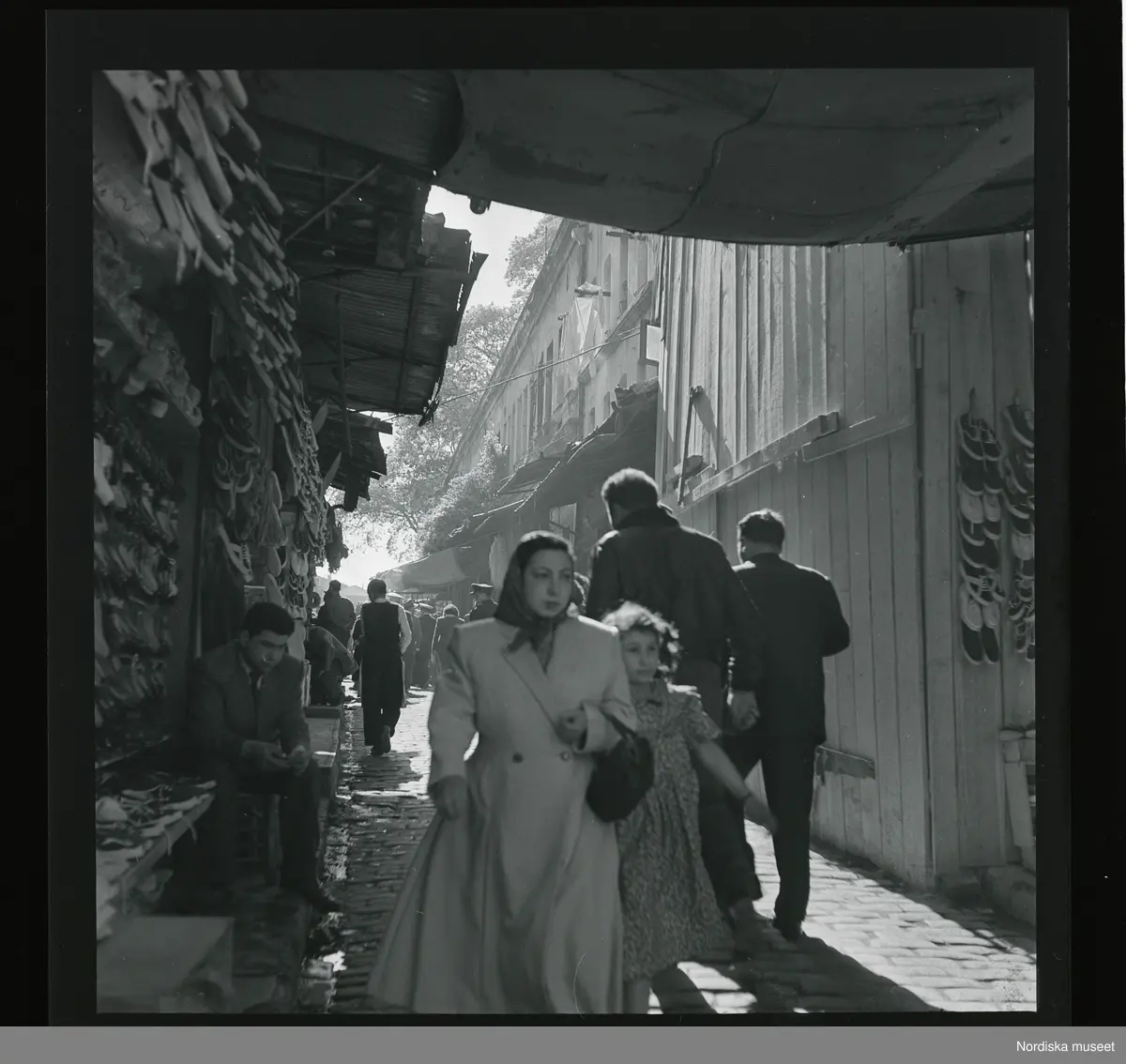 Folkliv i gränd. En kvinna och ett flicka passerar förbi en skobutik. Allhem SP 267 Istanbul