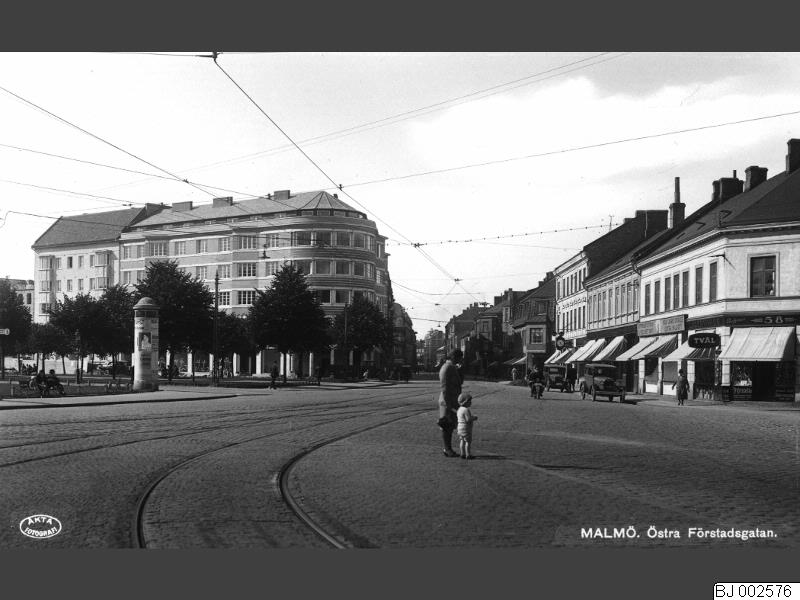 Hus med en affischpelare vid Östra Förstadsgatan