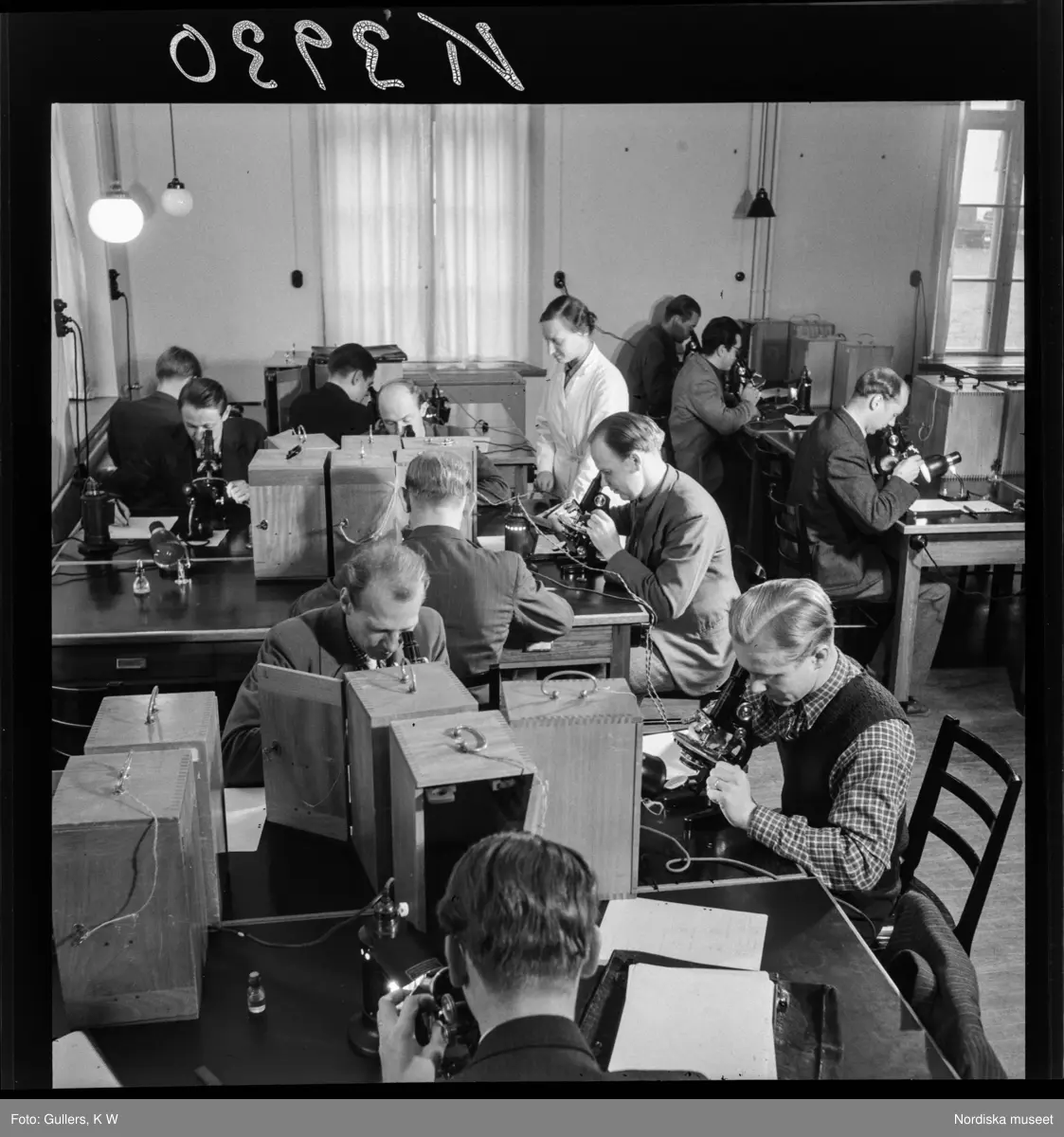 507 D Ultuna. I ett klassrum. Studenter studerar något i mikroskop.