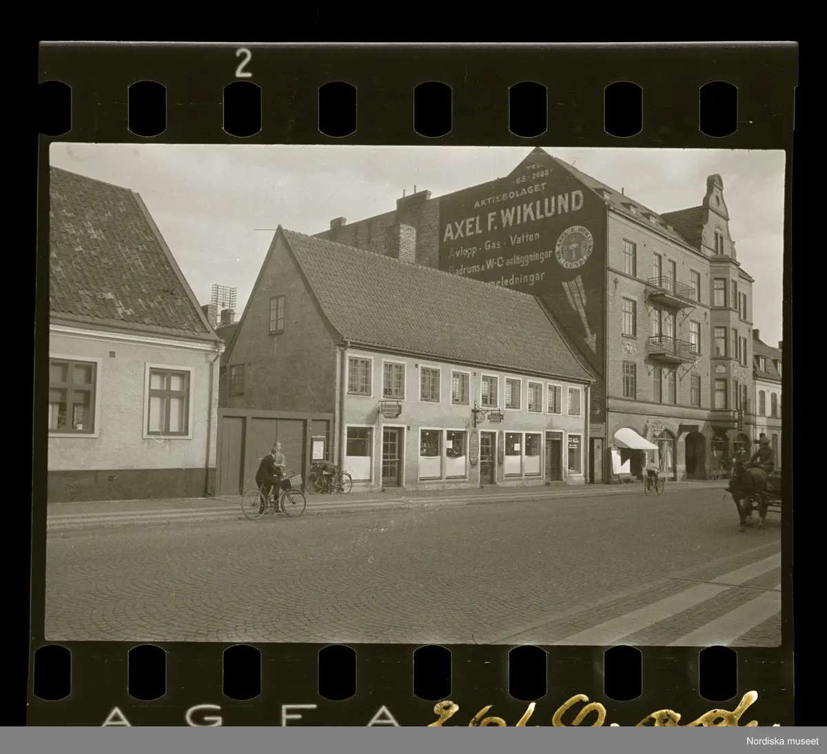 Gatubild. På en blindgavel målat: Aktiebolaget Axel F. Wiklund. Avlopp, gas, vatten, badrums- & WC-anläggningar.