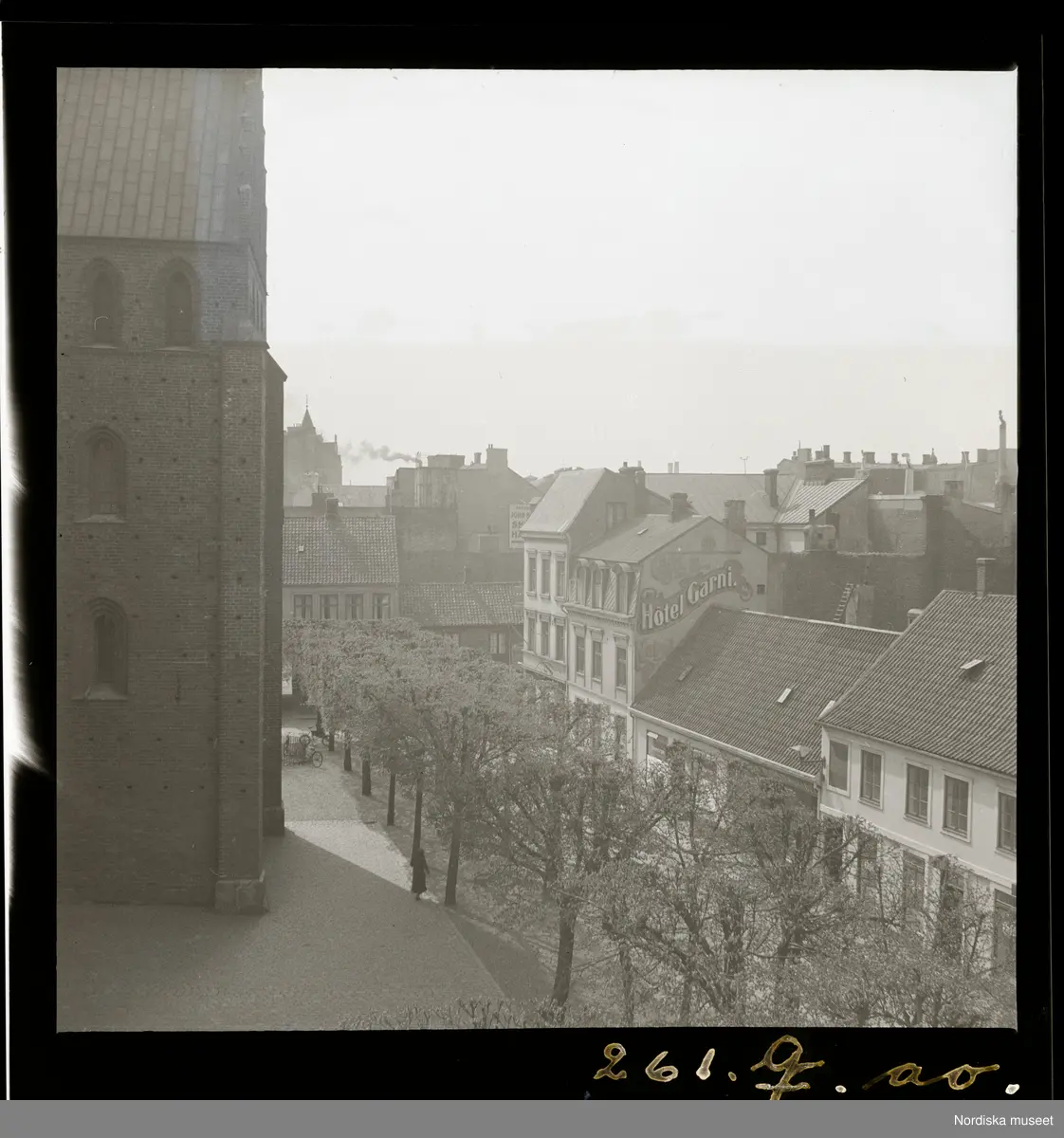 Text på montering i arkivet: Utsikten från hotell Mollbergs övre våning mot platsen vid Mariakyrkan. Helsingborg, Skåne. Foto: Andrén 1935