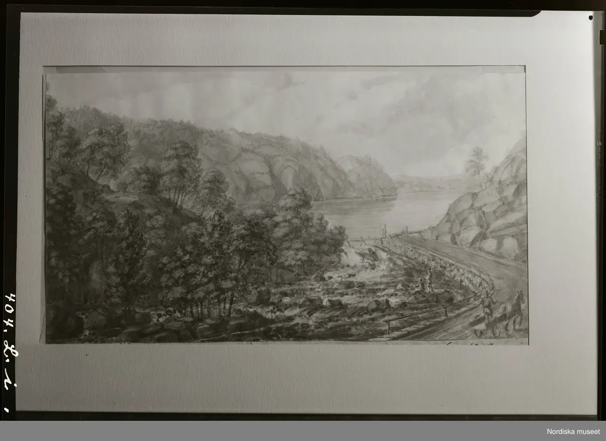 Foto av teckning/akvarell föreställandes landskap med vatten.