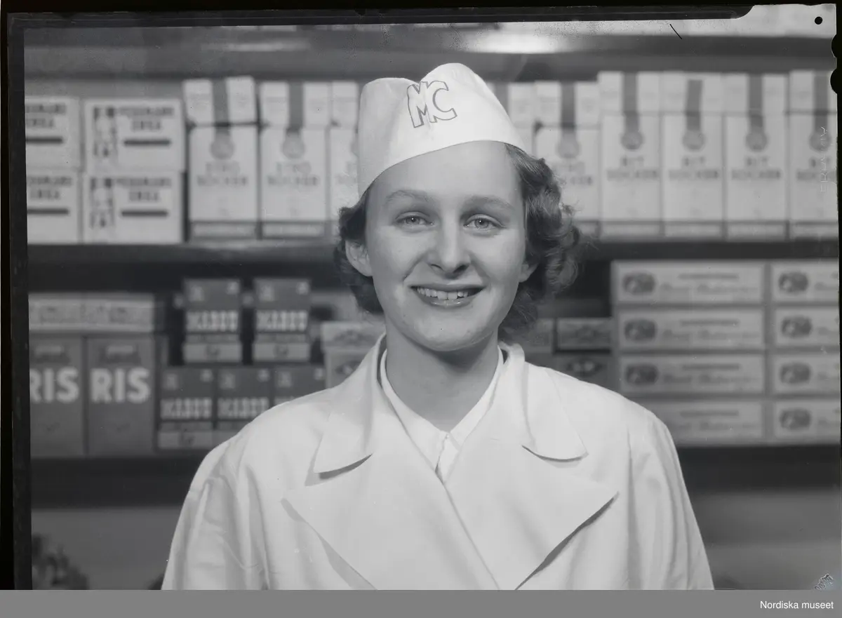 Porträtt av en kvinna som arbetar i en livsmedelsbutik, iklädd vit arbetsrock och hätta med logotyp "MC".