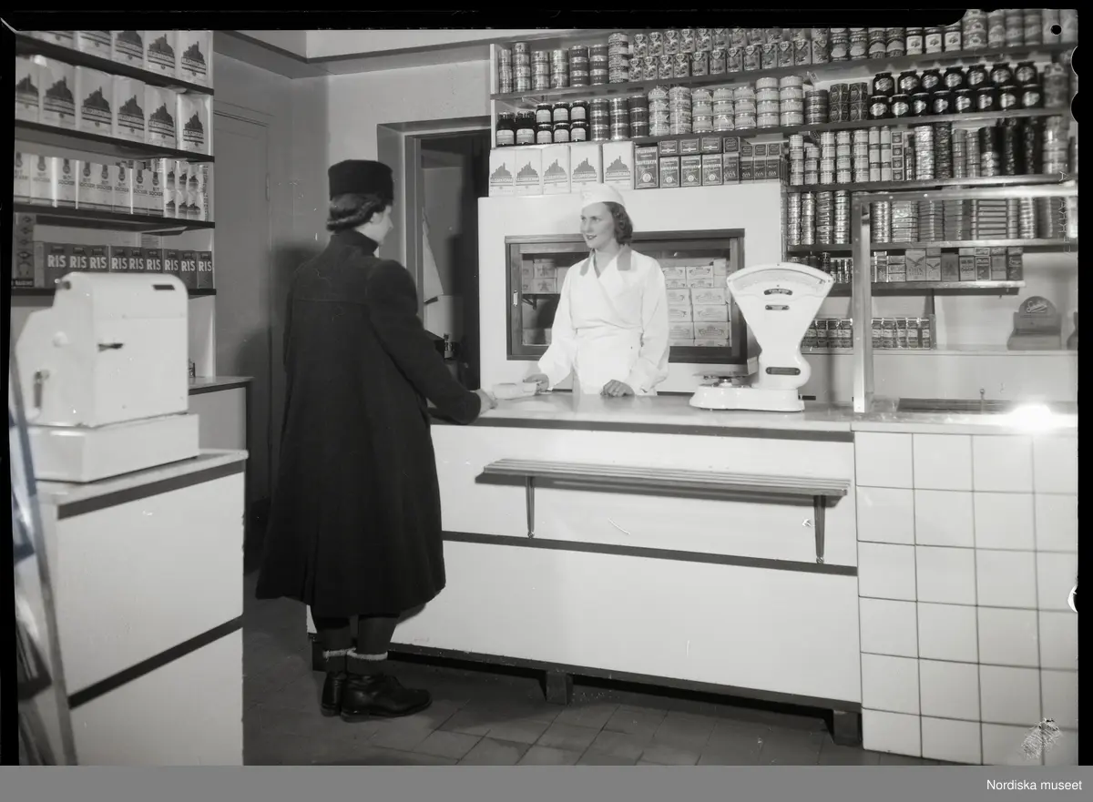 En expedit står bakom disken i en livsmedelsbutik och betjänar en kund.