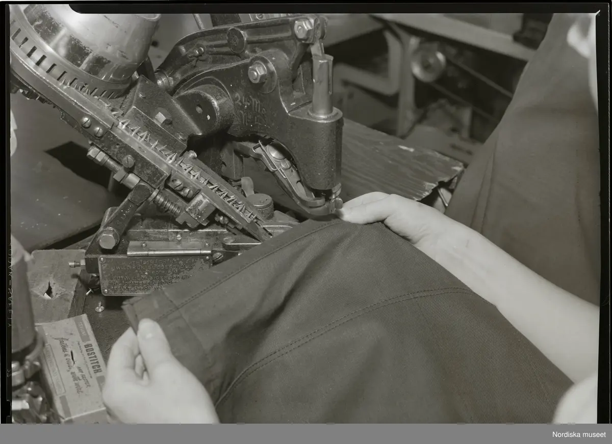 Textilindustri. Närbild. Tryckknapp fästs på ett par byxor. Dokumentation av Slitmanfabriken ABs verksamhet.