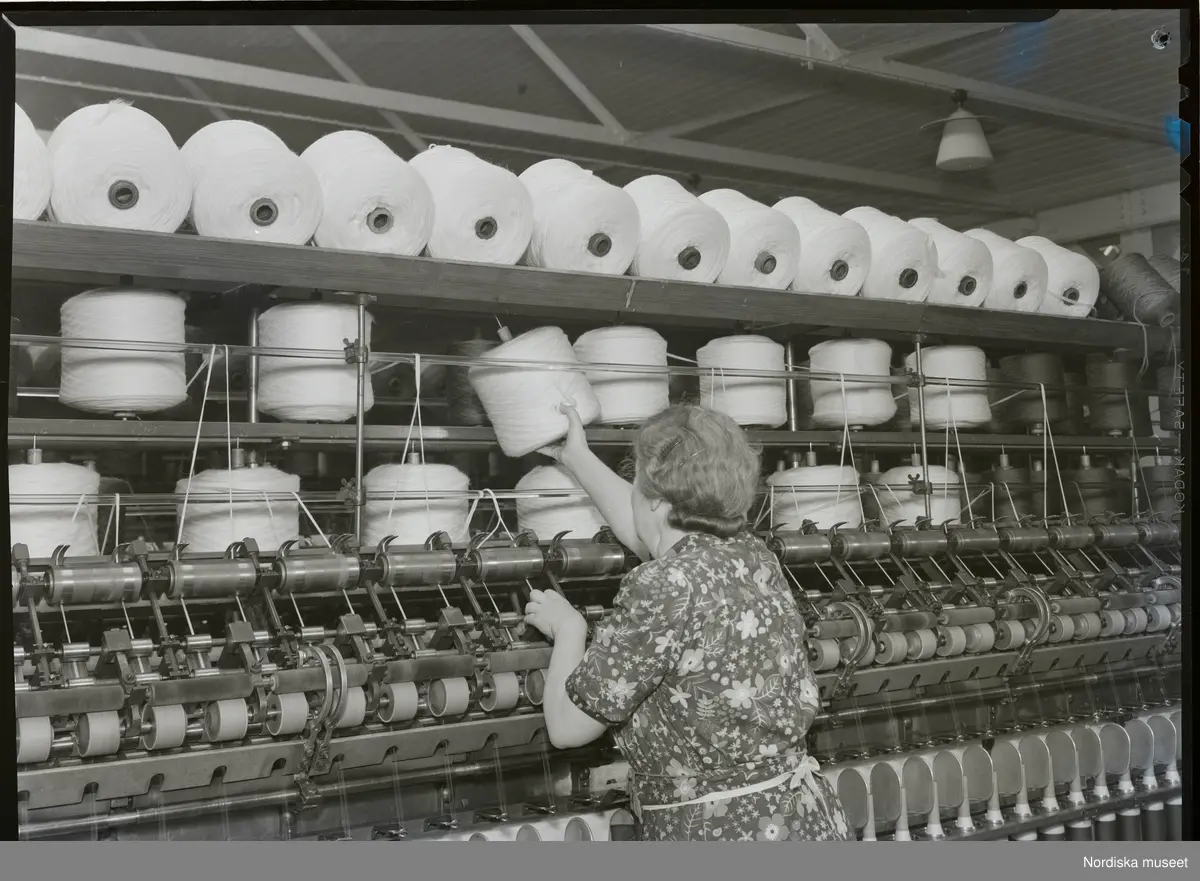 Textilindustri. En kvinna hanterar stora spolar tråd. Dokumentation av Slitmanfabriken ABs verksamhet.