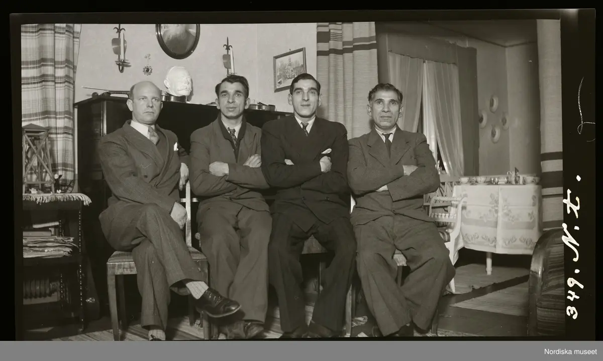 Porträtt av fyra män sittandes framför pianot i ett vardagsrum.