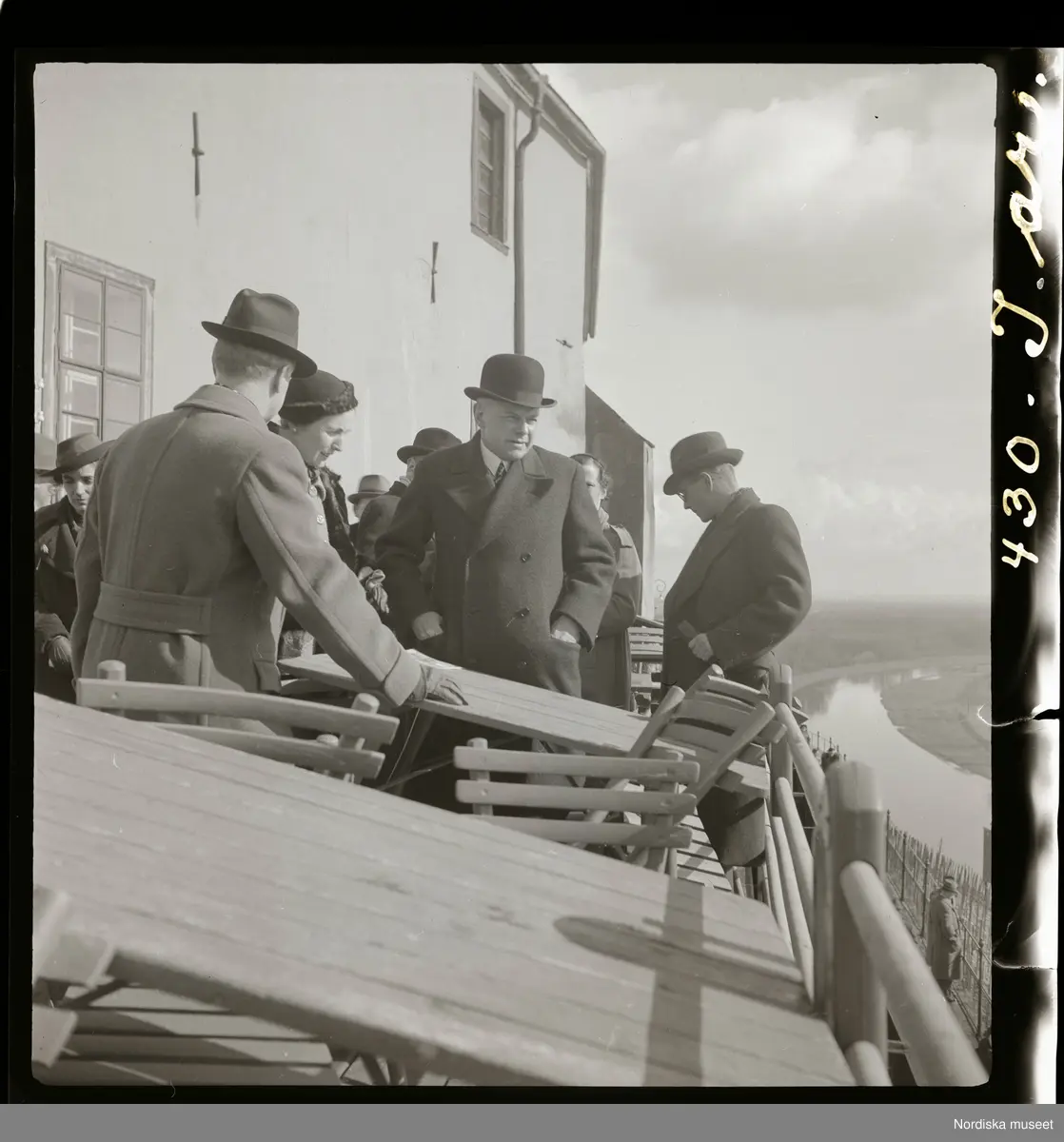 Nordiska museets utställning av folkkonst och Svenska slöjdföreningens utställning av modern svensk brukskonst i Prag, Tjeckien. Från en under utställningen anordnad utfärd. På bilderna syns professor Lundblom, fru Malmar, minister Malmar, konstnären Kåge.