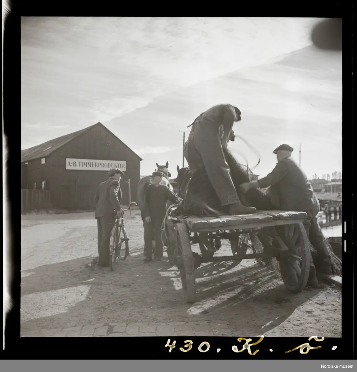Text på montering i arkivet: Bottengarnen halas av laget från båten upp på bonden Ingels vagn och köras till torkplatsen vid Åkroken.