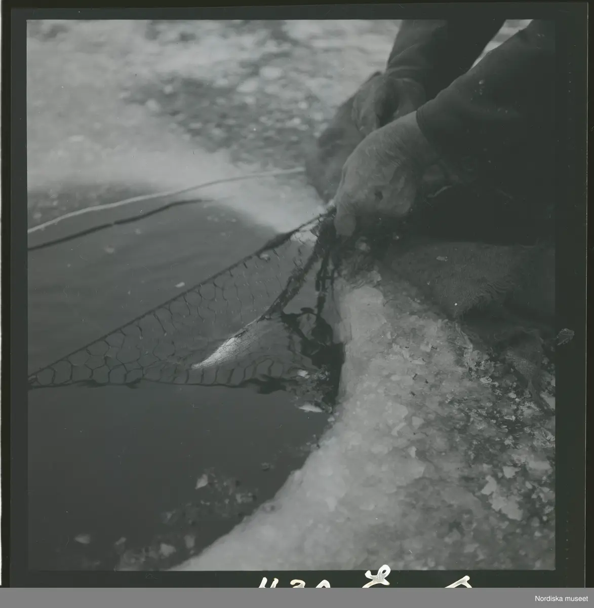 Vinterfiske på sjön. En man vittjar nät man lagt genom ett hål i isen.