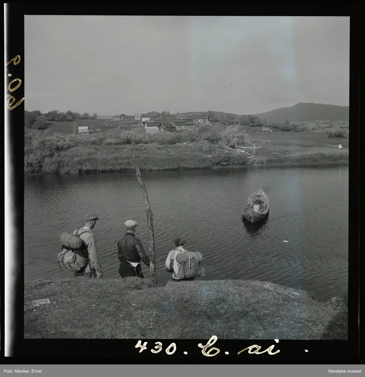 Tre män drar en eka över vattnet vid fjällgården i Kummavuopio, sommaren 1943.