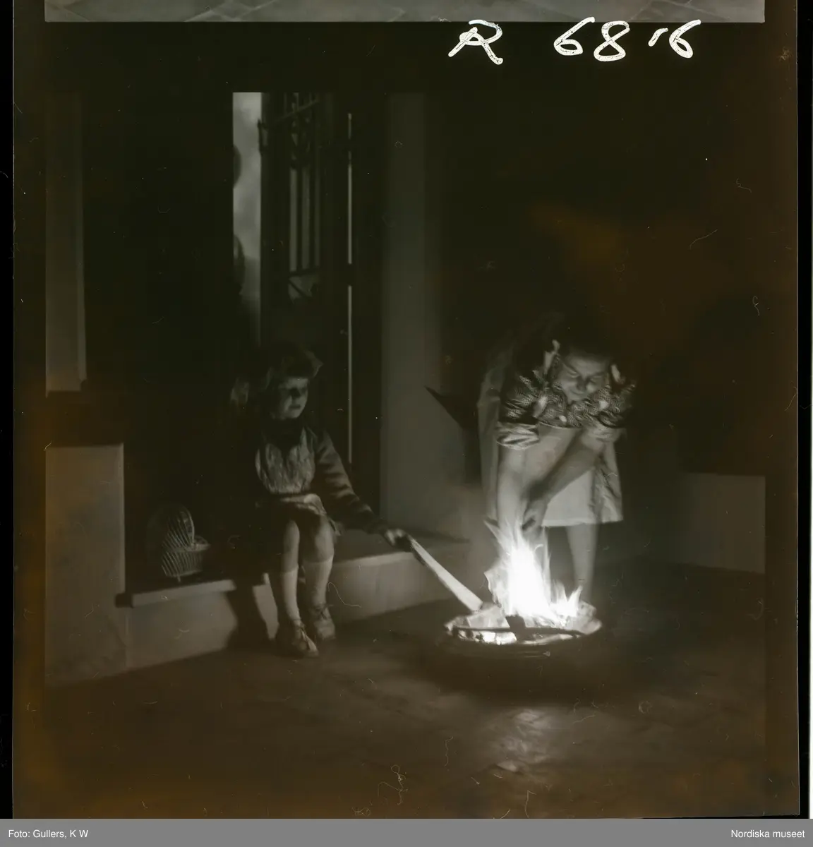 568 F. Stieg Trenter, Torremolinos. En flicka och en kvinna på tröskeln utanför ett hus. De bränner något på ett fat framför dem.