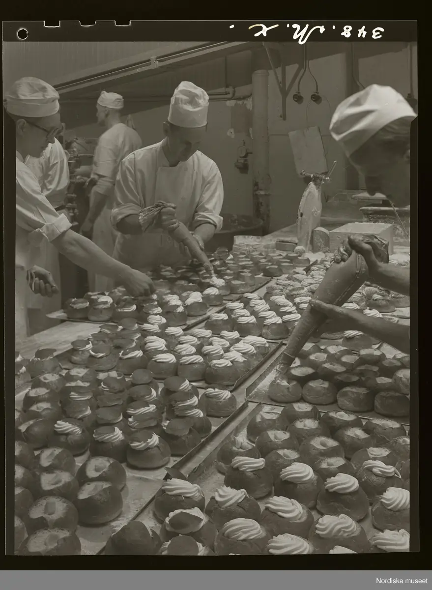Bageri. Semlor bakas, två sockerbagare spritsar grädde.