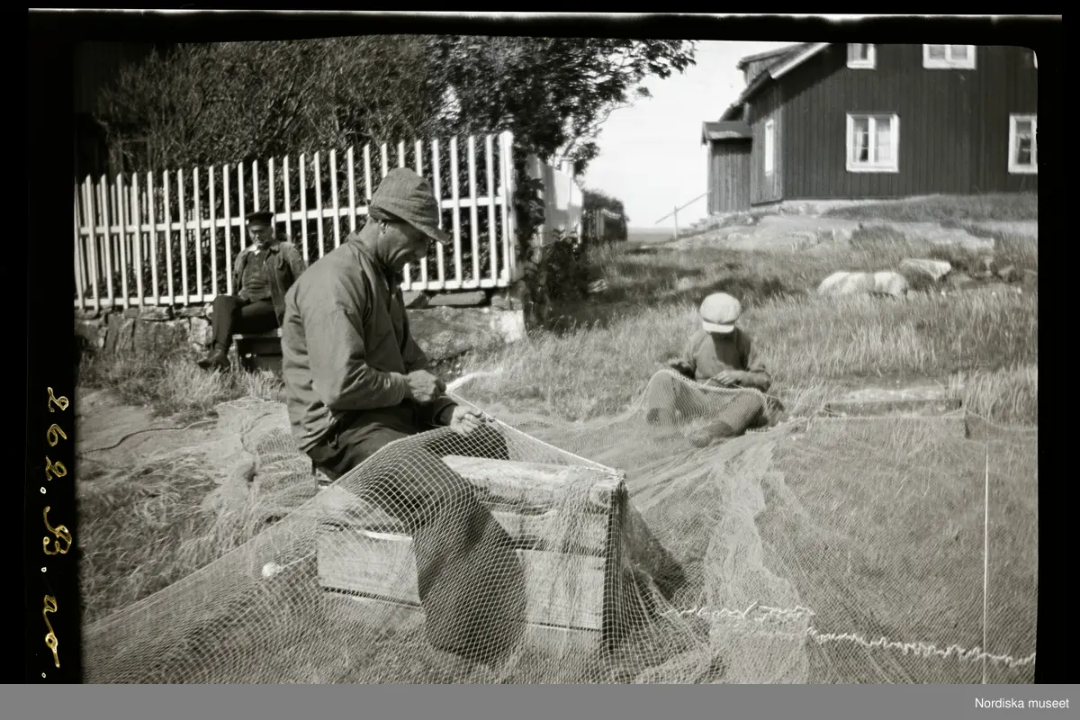 En man och en pojke sitter utanför ett hus och lagar fiskenät.