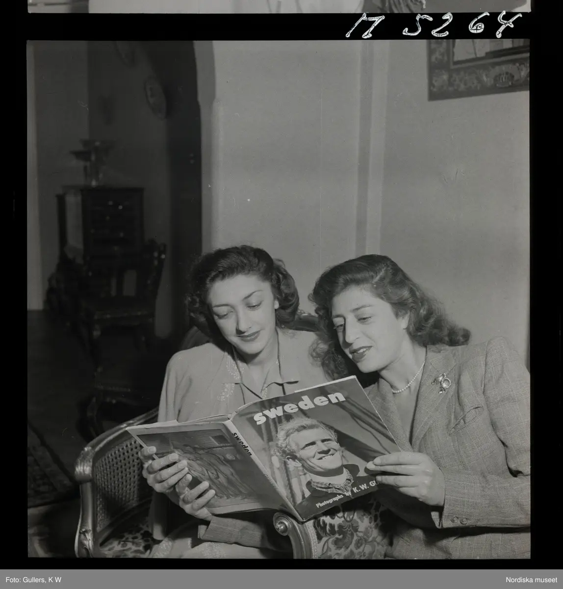 Istanbul. Två kvinnor tittar i boken "Sweden" av K W Gullers.