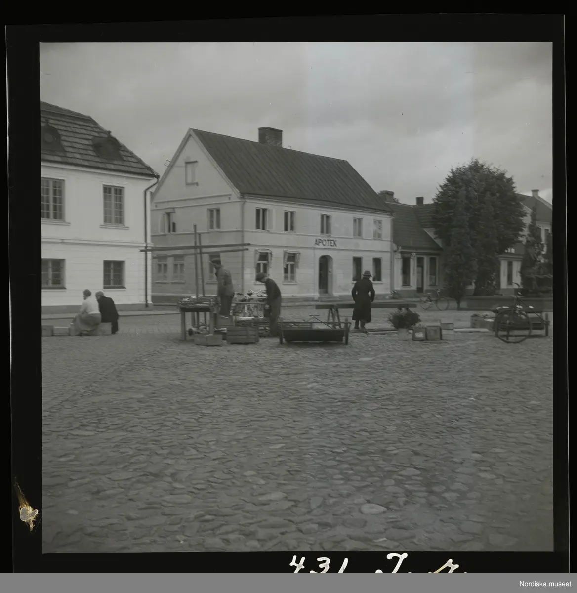 Titel: Torghandel framför apotek på Stortorget, Laholm.