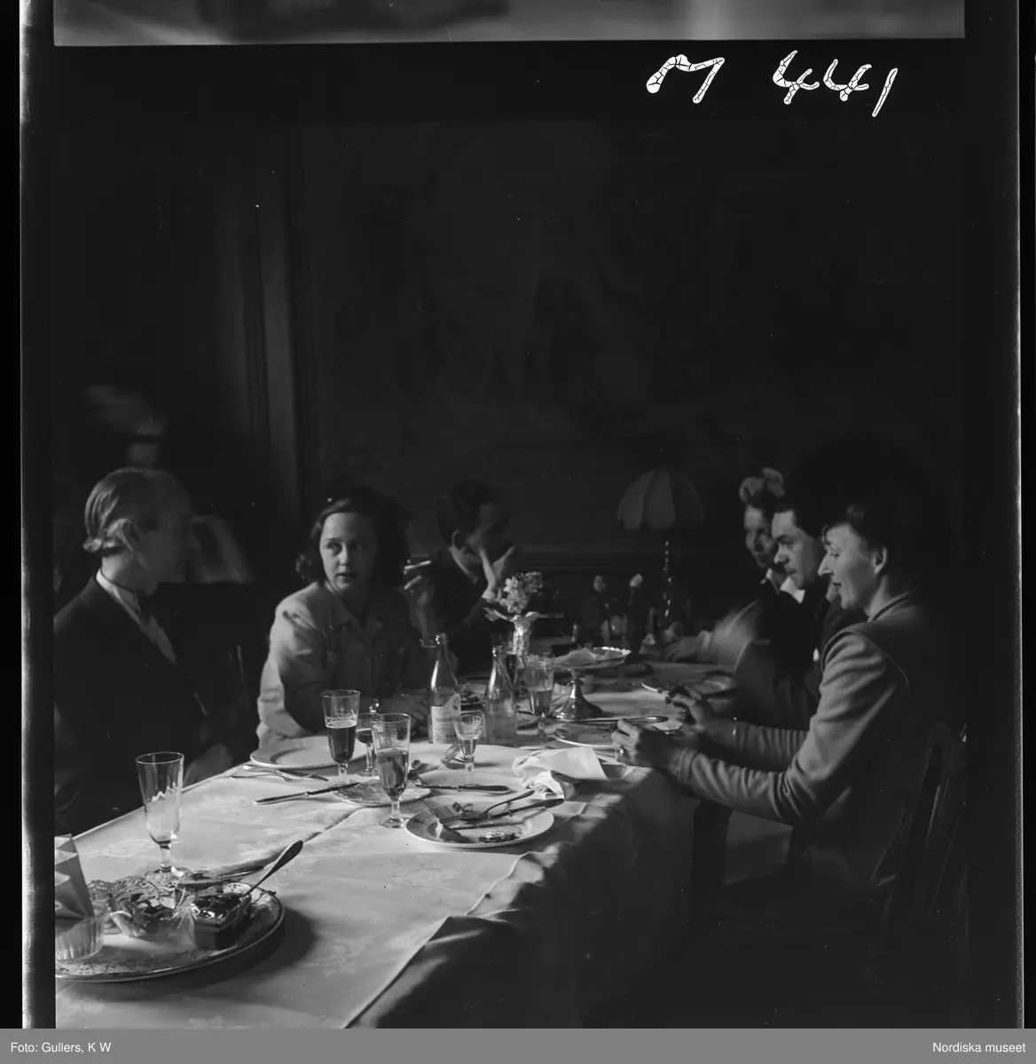 513 E Redaktör Runar Karlströmer hem från Danmark. Ett sällskap har just ätit middag vid ett dukat bord.