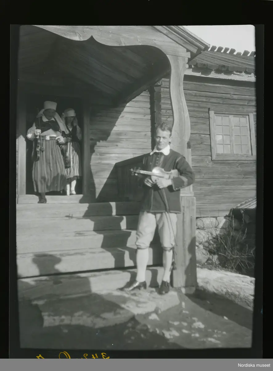 Folkmusiker. En man med fiol underarmen står på trappen, två kvinnor kommer ut genom dörröppningen. Skansen, Stockholm.