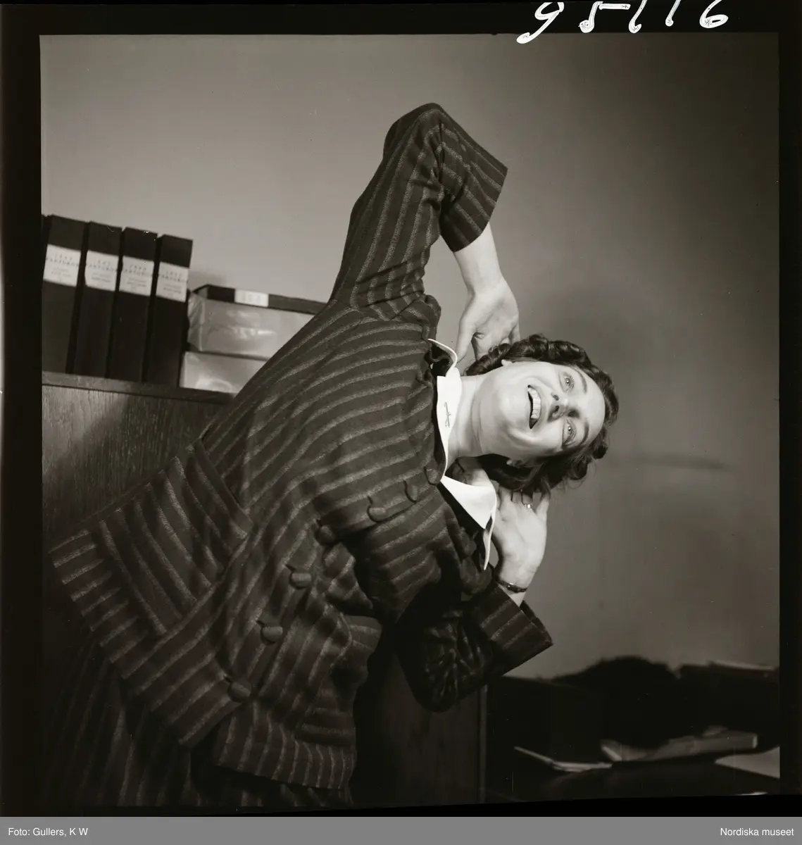 609 G, Åtvidabergs Industrier kontorsgymnastik. Kvinna gymnastiserar på ett kontor.