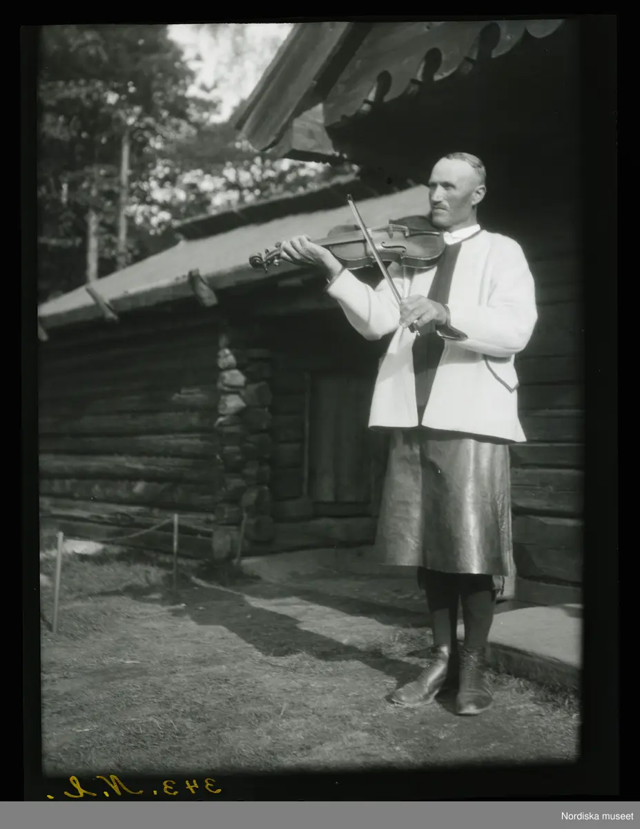 Titel: Man i folkdräkt spelar fiol. Skansen, Stockholm.