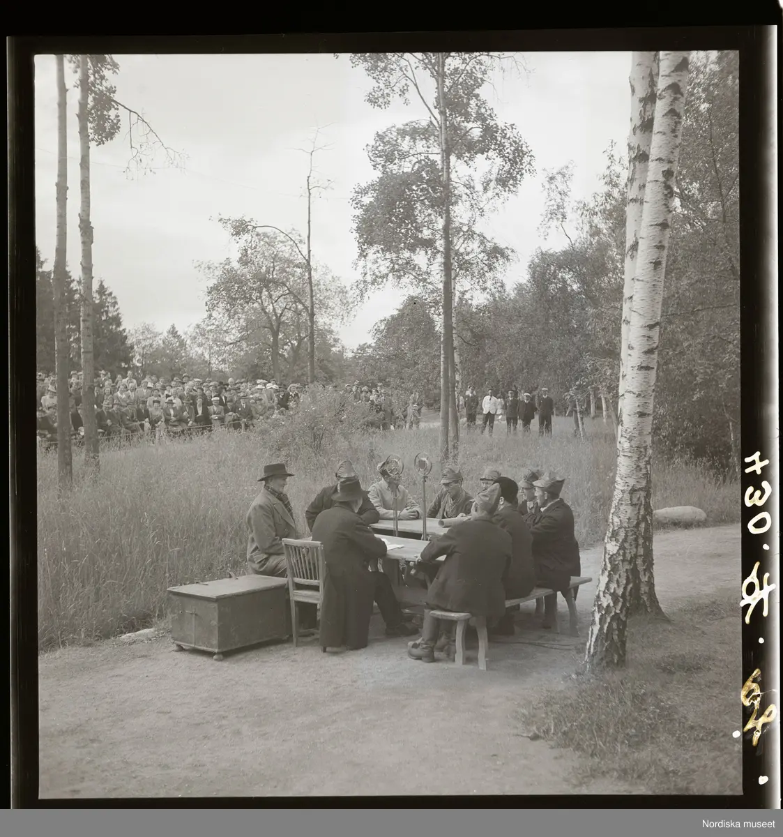 En grupp män sitter kring ett par bord uppställda utomhus på Skansen, Stockholm. Mellan dem står mikrofoner uppställda och en av männen har anteckningar framför sig. Möjligen radioupptagning/inspelning.