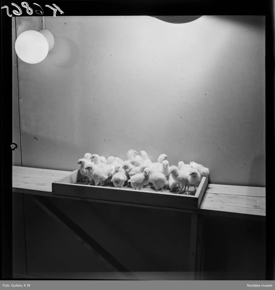 507 E Ultuna Fjäderfälaboratorium. Kycklingar på ett bord.