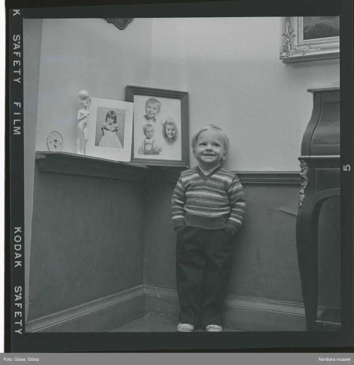 En liten pojke står framför ett par inramade fotografier av barn.