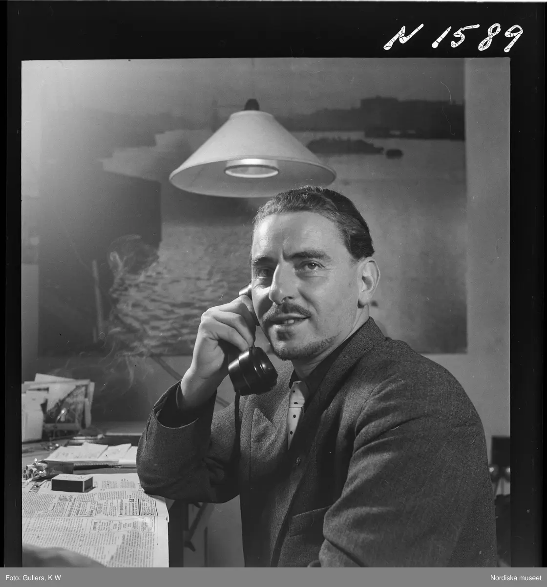 513 E Redaktör Runar Karlströmer, på studion. Runar Karlströmer pratar i telefon vid sitt skrivbord.
