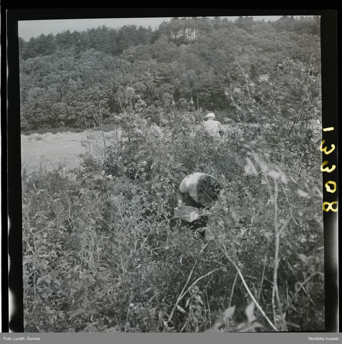 En kvinna plockar vildhallon i en liten spånflätad korg.