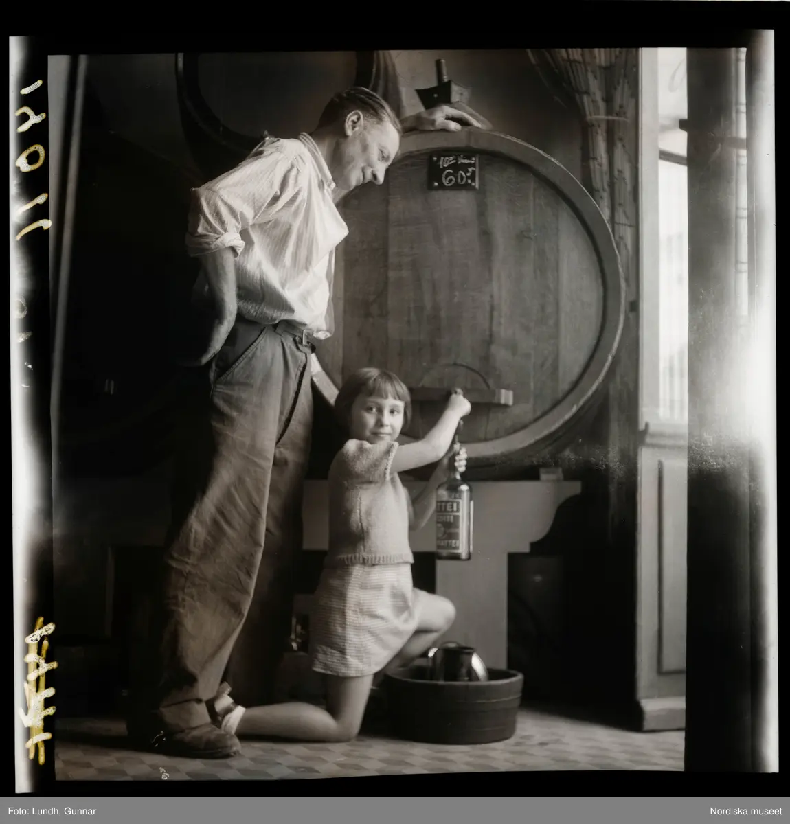 1950. Frankrike. En flicka och en man tappar ut vin från en tunna.