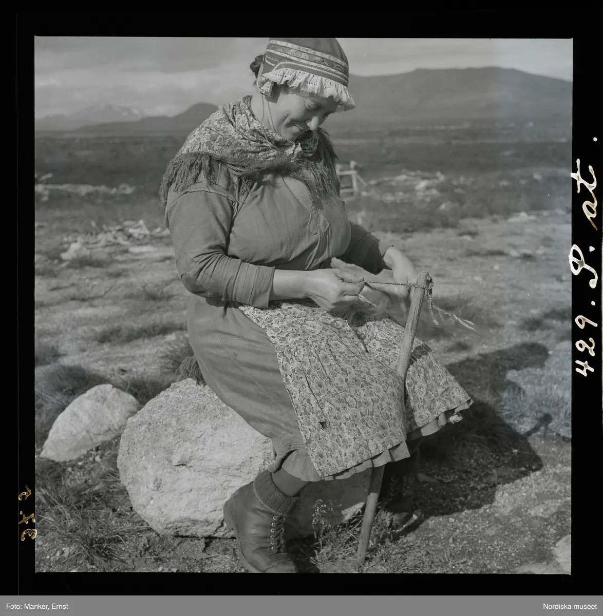 Nordsamisk kvinna sitter på en sten och flätar band.