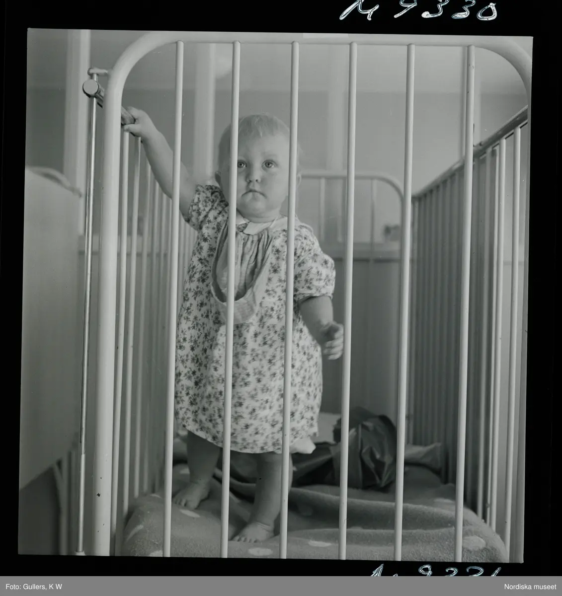 1708 E Mölnlycke väverier, Krokslätt. Ett litet barn står i en spjälsäng.