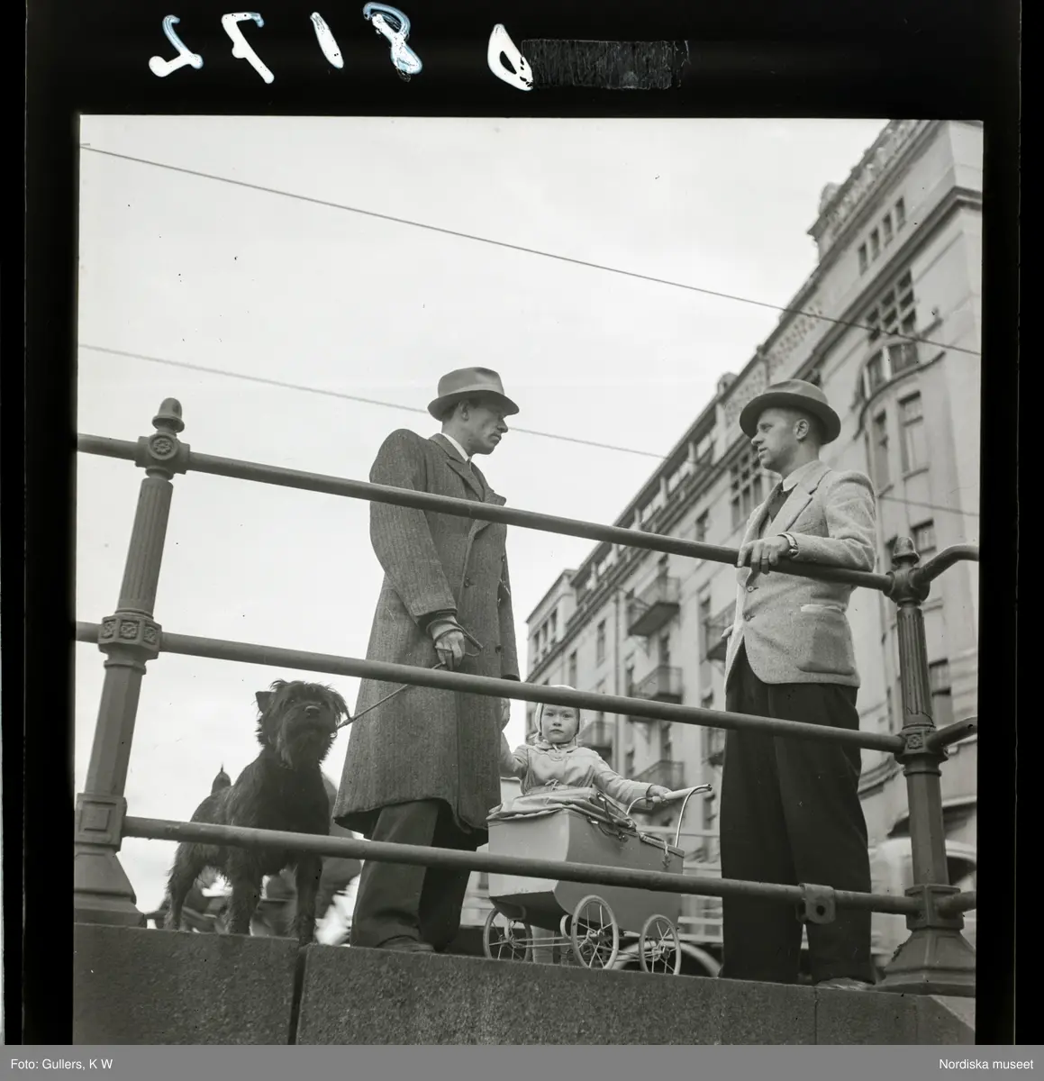 Ett par män samtalar ståendes ute på gata. Den ene med sitt barn i barnvagn och hund i koppel.