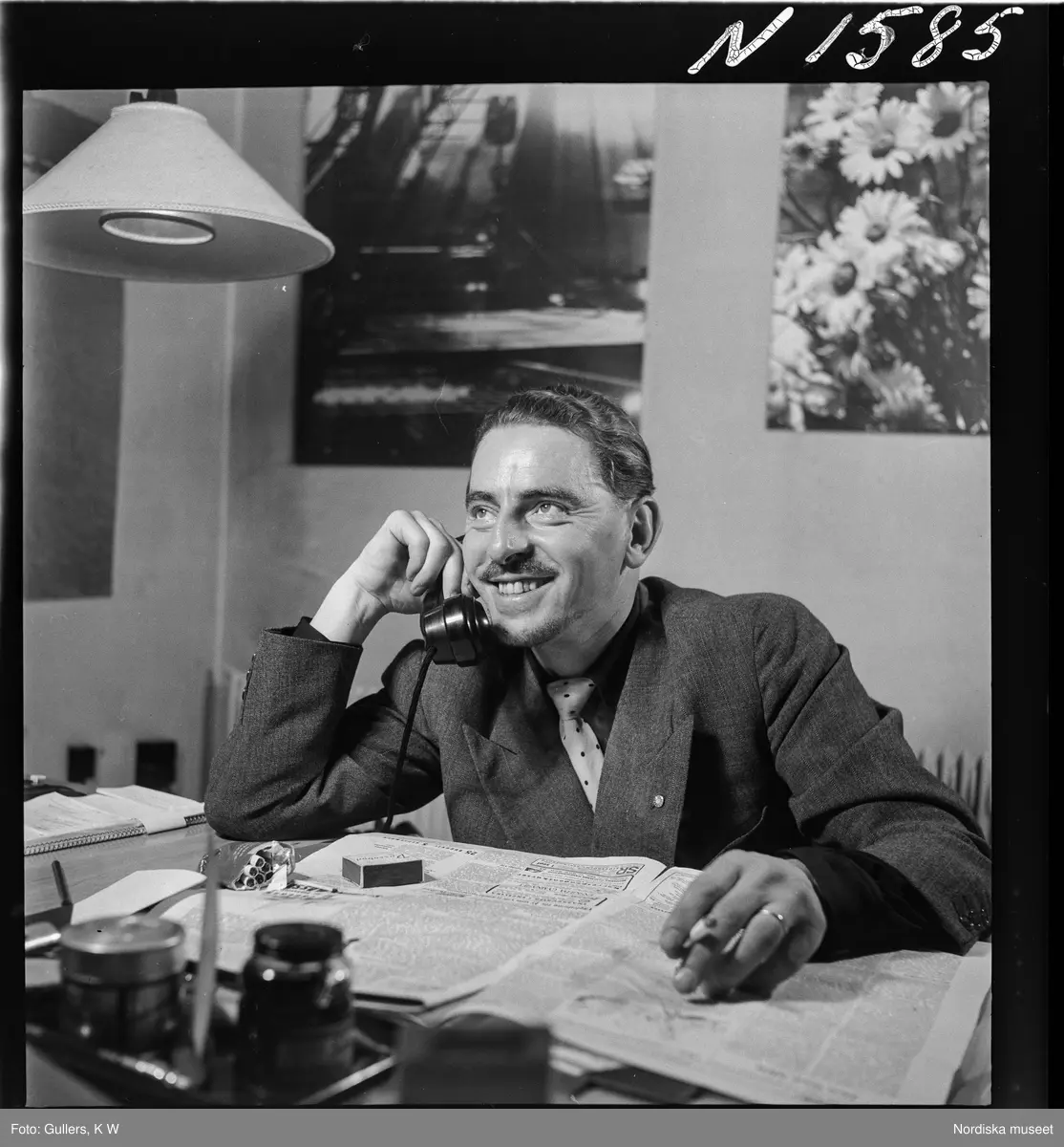 513 E Redaktör Runar Karlströmer, på studion. Runar Karlströmer pratar i telefon vid sitt skrivbord.