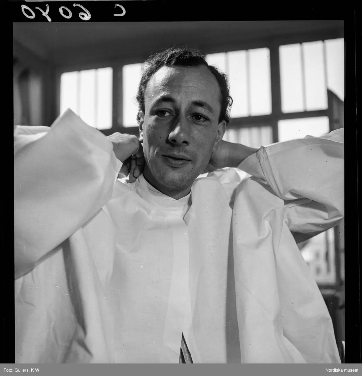 Skådespelaren Gunnar Sjöberg under föreberedelser framför spegeln i en sminkloge.