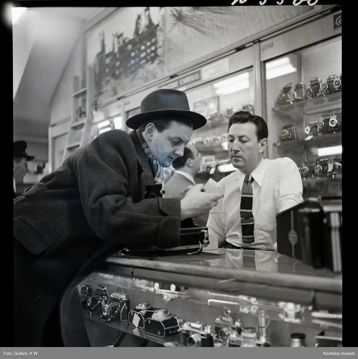 1690 New York allmänt (N.Y. Herald Tribune). K W Guller vid disken i en foto-affär, tittar på varor med en expidit.