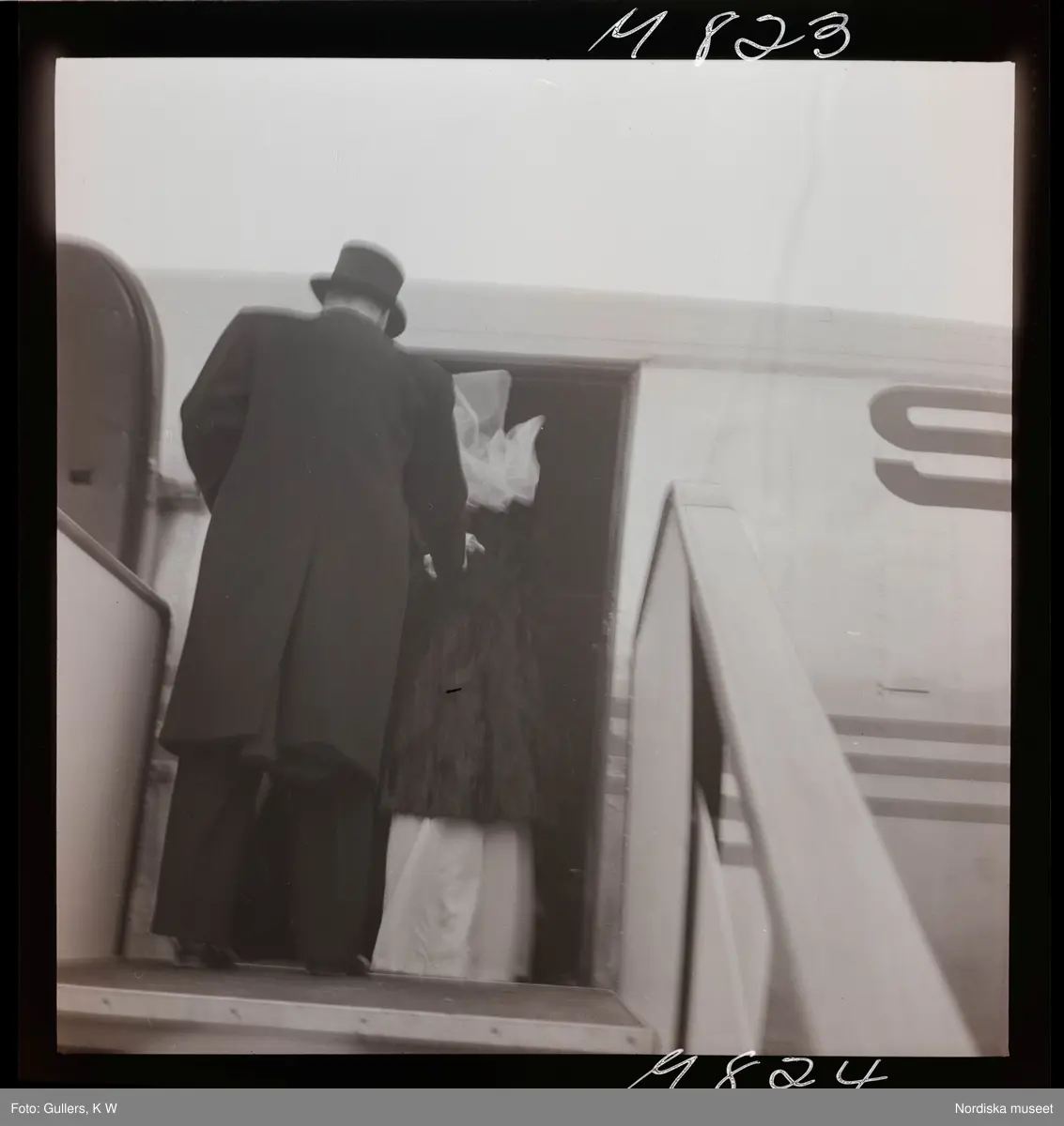 "1680 Bröllop i luften med Abas DC-4 ""Sunnan"" till Paris " Ett brudpar stiger på ett flygplan.