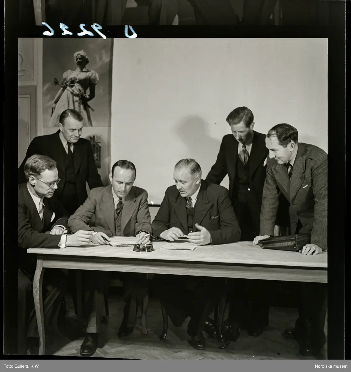 Medlemmar i fotoklubb kring ett skivbord läser dokument.