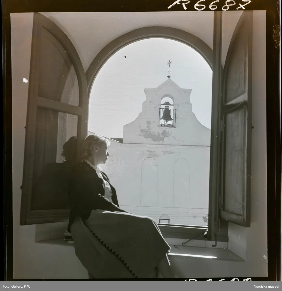 568 F. Stieg Trenter, Torremolinos. En kvinna sitter i ett öppet fönster. Ett klocktorn syns på andra sidan gatan.