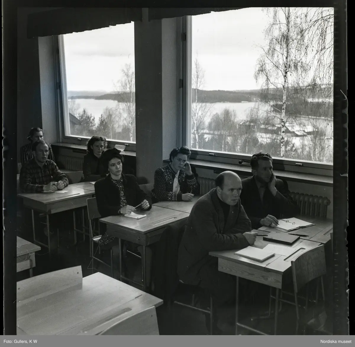 584 Brunsviks Folkhögskola. Studenter sitter i sina skolbänkar invid stora fönster i ett klassrum.