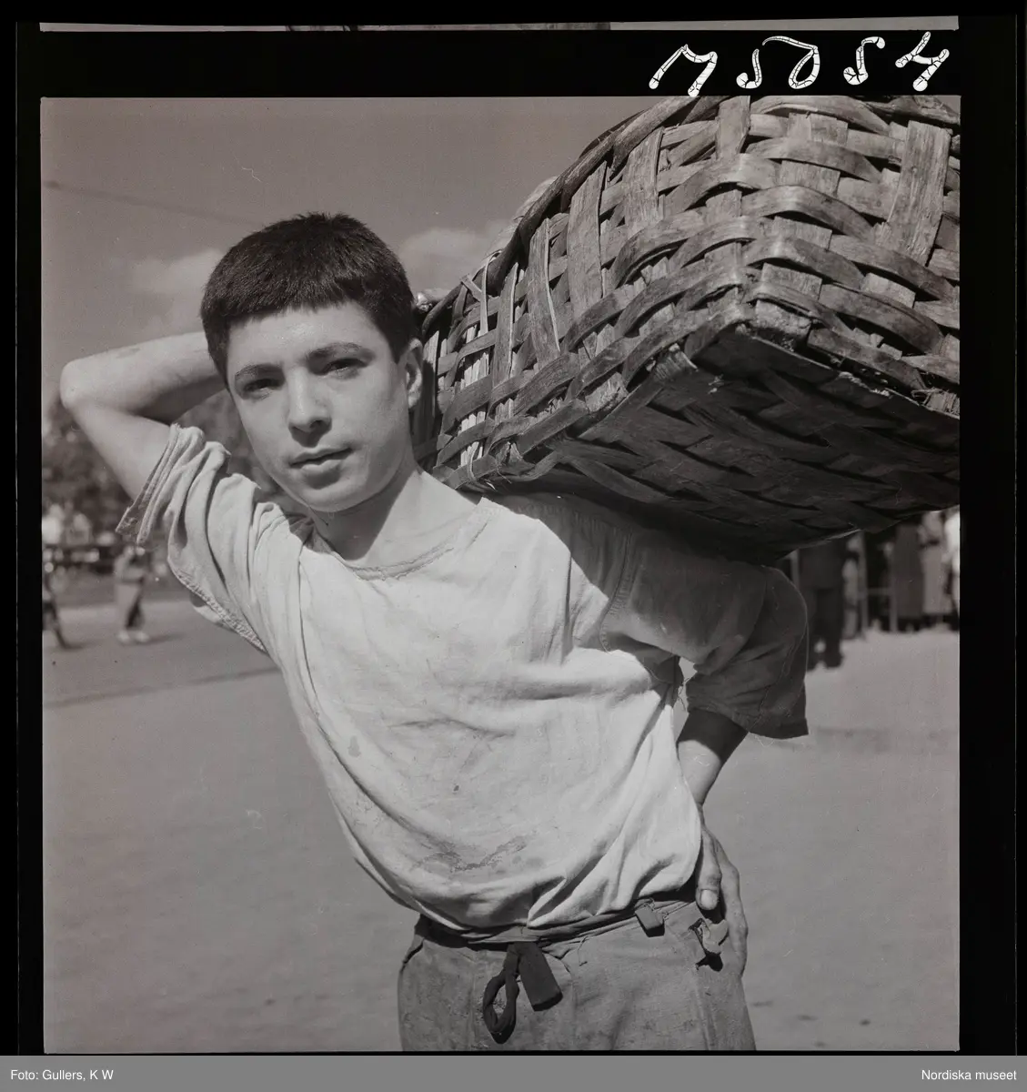 1717/L Istanbul allmänt. Porträtt av en pojke som bär en korg på ryggen.