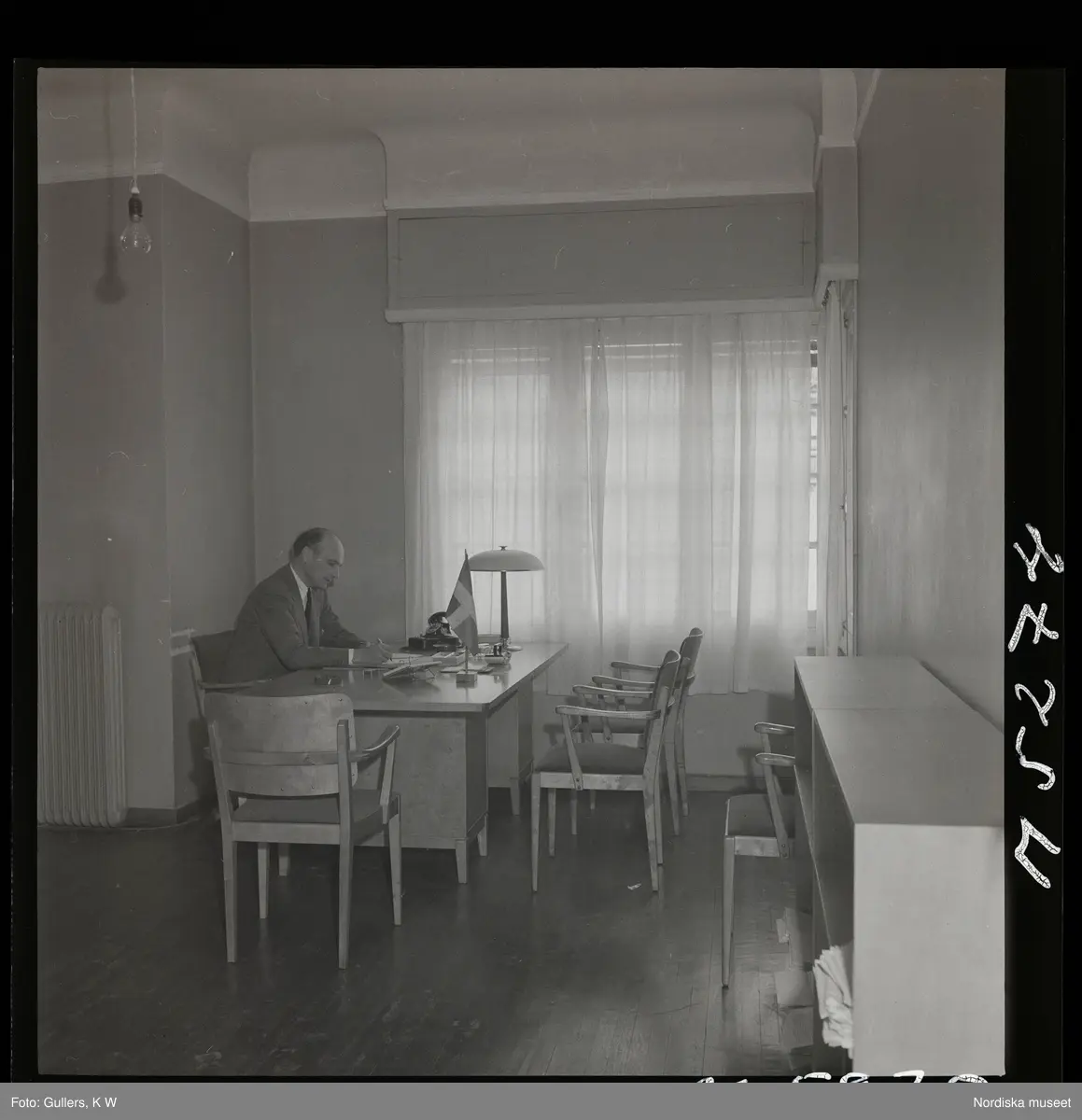 1717 I Svenska konsulatet Aten. En man vid sitt skrivbord, varpå det står en svensk flagga.